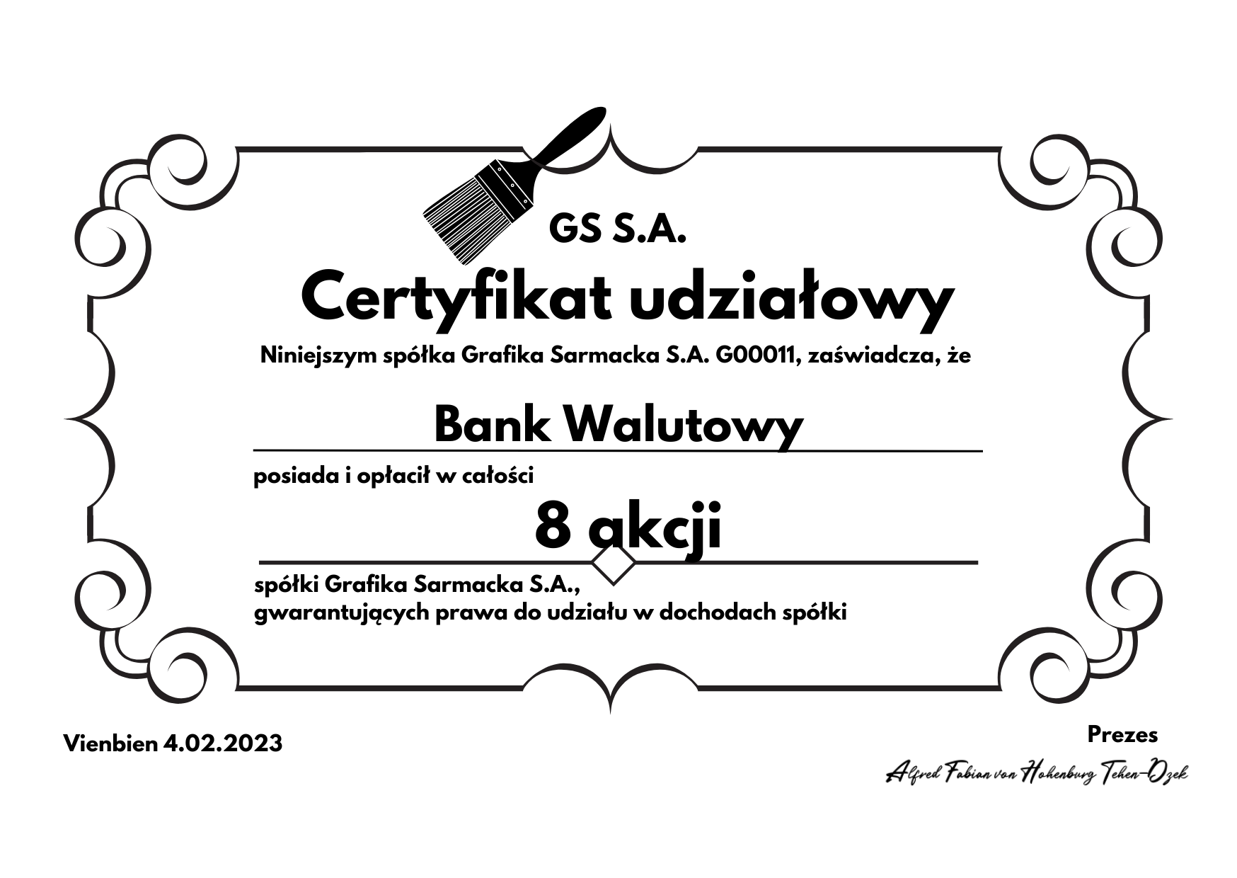 Certyfikat własności akcji Grafiki Sarmackiej SA