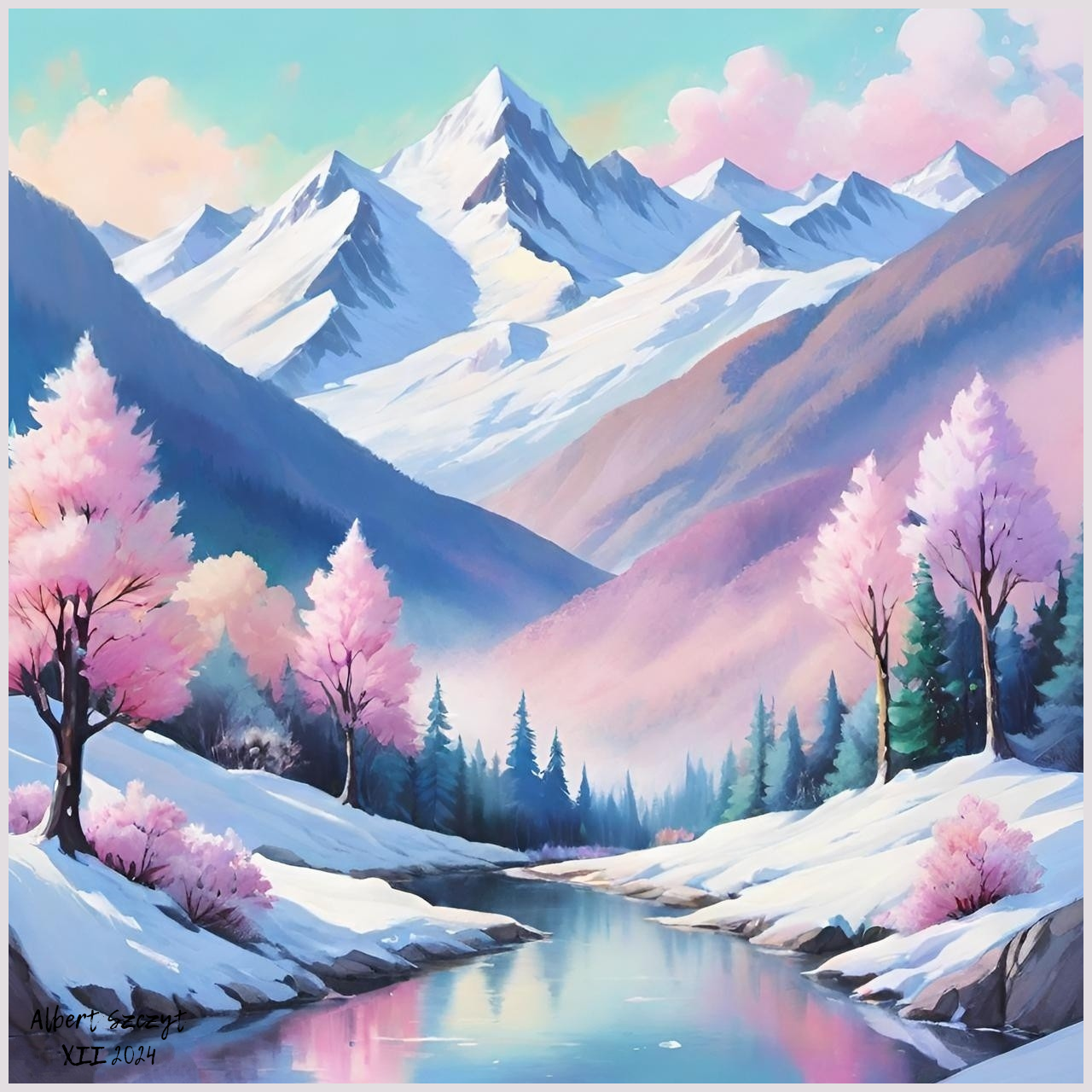 Obraz przedstawia krajobraz górski zimą, który autor przełamuje dodając kwitnącej różowej roślinności. Autorem jest grodziski malarz, Albert Szczyt.